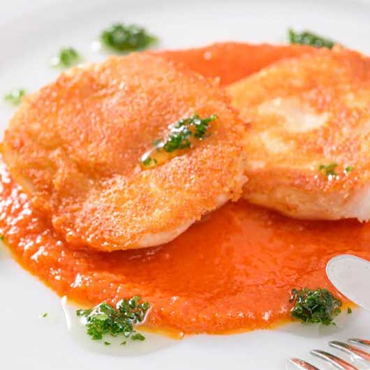 パン粉のカリっとした⾷感、チーズの濃厚な⾵味、トマトソースの酸味の三位⼀体のベストマッチングをご堪能下さい。