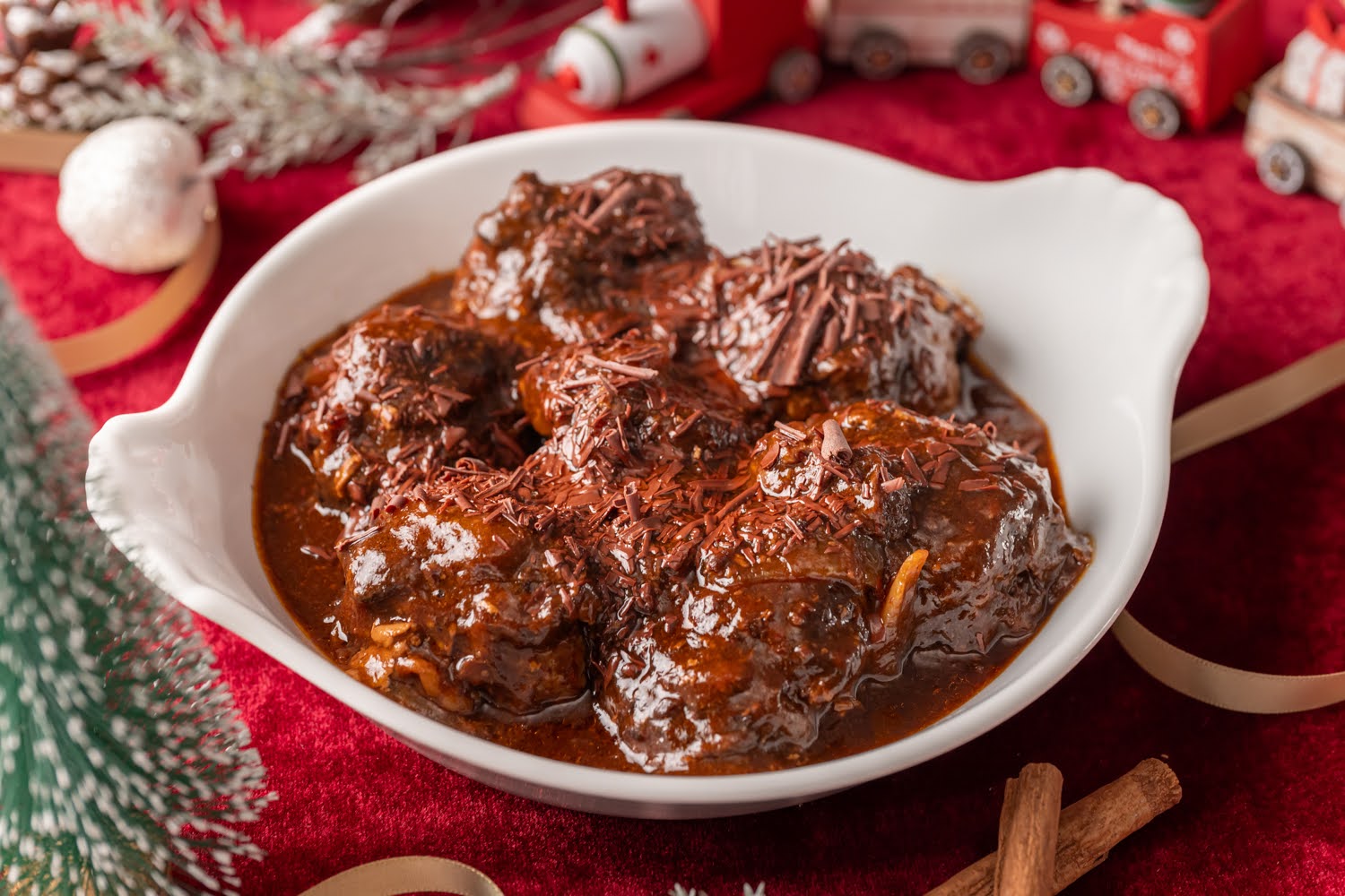 - カカオ⼊りの⾁々しい煮込みハンバーグ