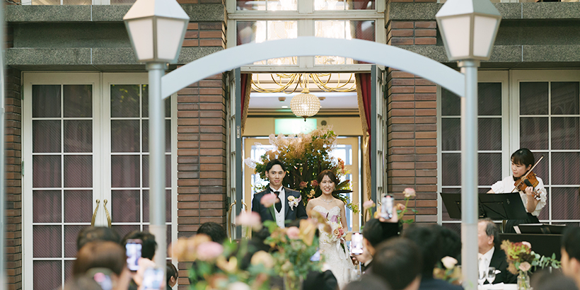 新婦様はシンプルながらも繊細で美しいドレスを新郎様はベージュのタキシードを爽やかに着こなしていらっしゃいました。