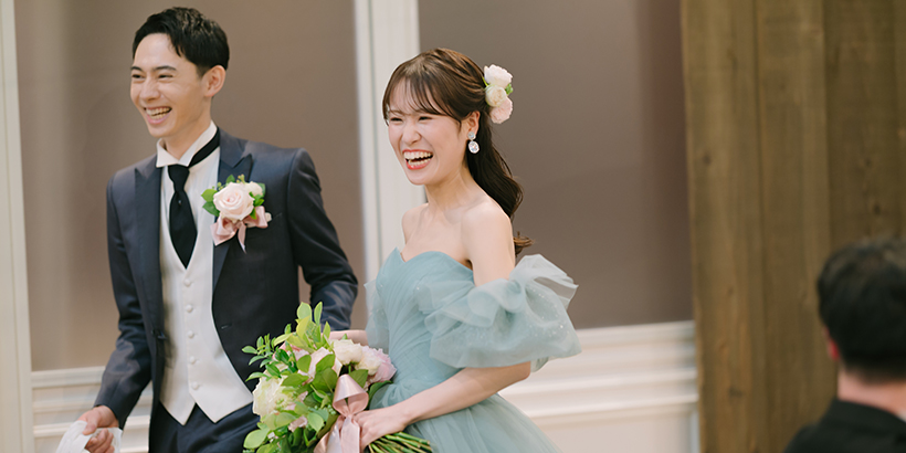 お色直しでは新婦様は鮮やかなブルーのドレスでご入場。