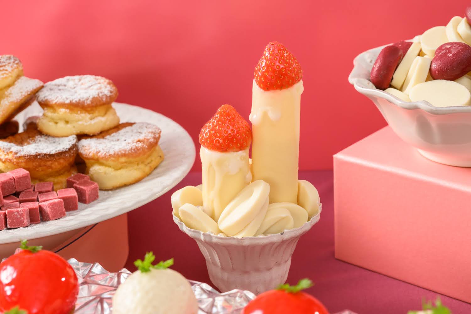 ・⾚いいちごムース・⽩(ホワイトチョコ)のいちごムース・いちごのタルト・いちごのロールケーキ・いちごのキャンドルケーキ・いちごのクレームダンジュ・いちごのパンナコッタ・いちごのマカロン・いちごのアメリカンクッキー・いちごのギモーブ・いちごの⽣チョコレート・いちごのサングリア(アルコール⼊)・いちごとシードルのジュレ(アルコール⼊)・マンディアンショコラ・アーモンドチョコ・ソフトクリーム(いちご・バニラ)