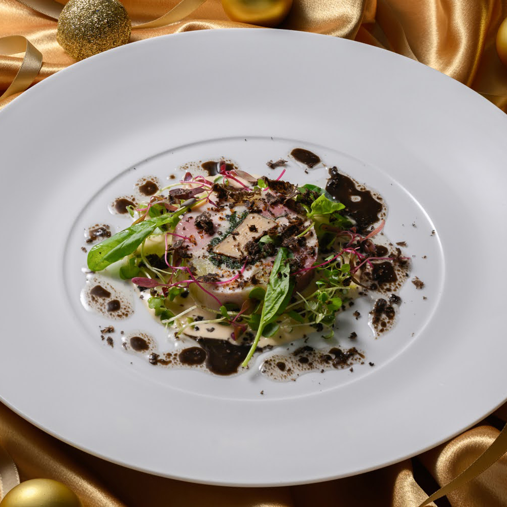 - 丹波地鶏とフォワグラ、但馬鴨のバロンティーヌ トリュフ風味