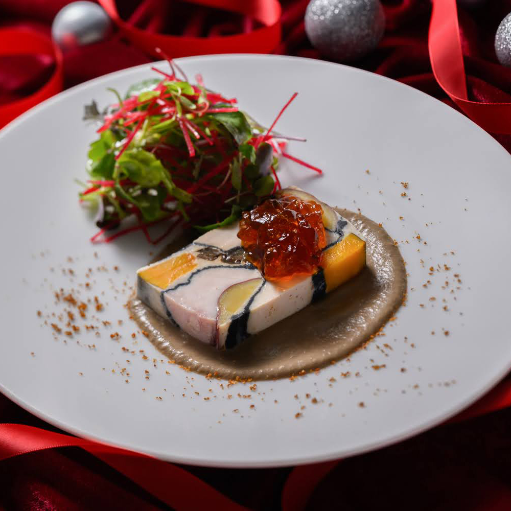 オーベルジュの特徴の一つである、邸宅の中庭のようにゆったりとした空間で、豪華さとカジュアルさを纏ったクリスマスディナーをどうぞ。